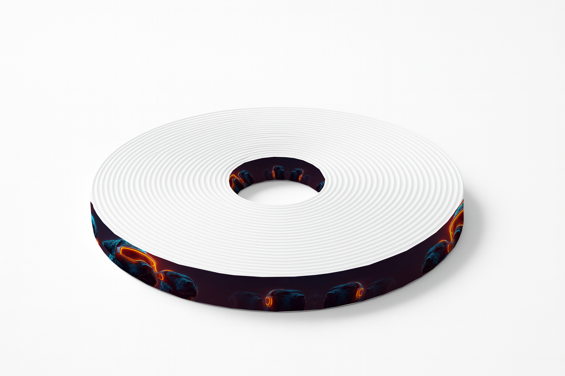 Sur ce BioThane® imprimé, une série de chiens à l’expression sérieuse arborent des casques audio orange néon ou des lunettes de réalité virtuelle, le tout sur un fond sombre intense qui met en valeur chaque détail lumineux. Un design parfait pour les fans de culture geek, de cyberpunk ou tout simplement d’originalité assumée.