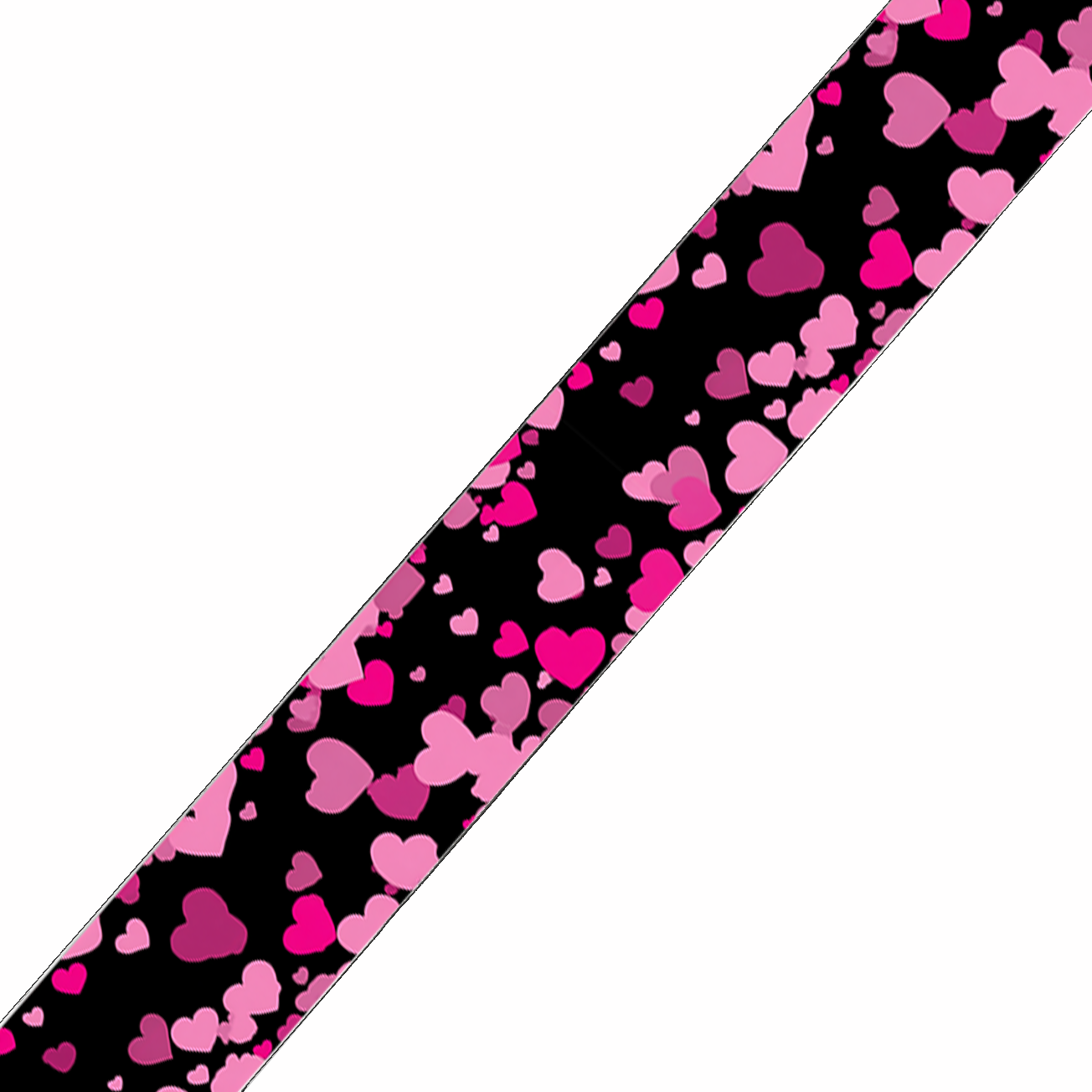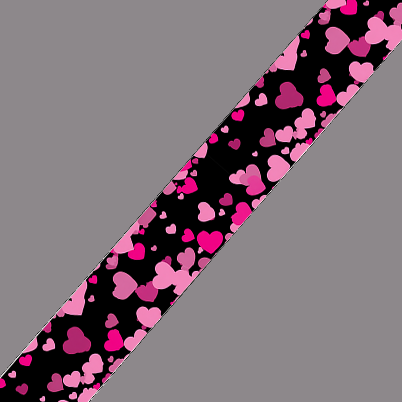 Ce BioThane imprimé présente une pluie de cœurs roses et fuchsia flottant sur un fond noir profond. Le contraste marqué met en valeur le motif et lui donne un style à la fois romantique, moderne et affirmé.