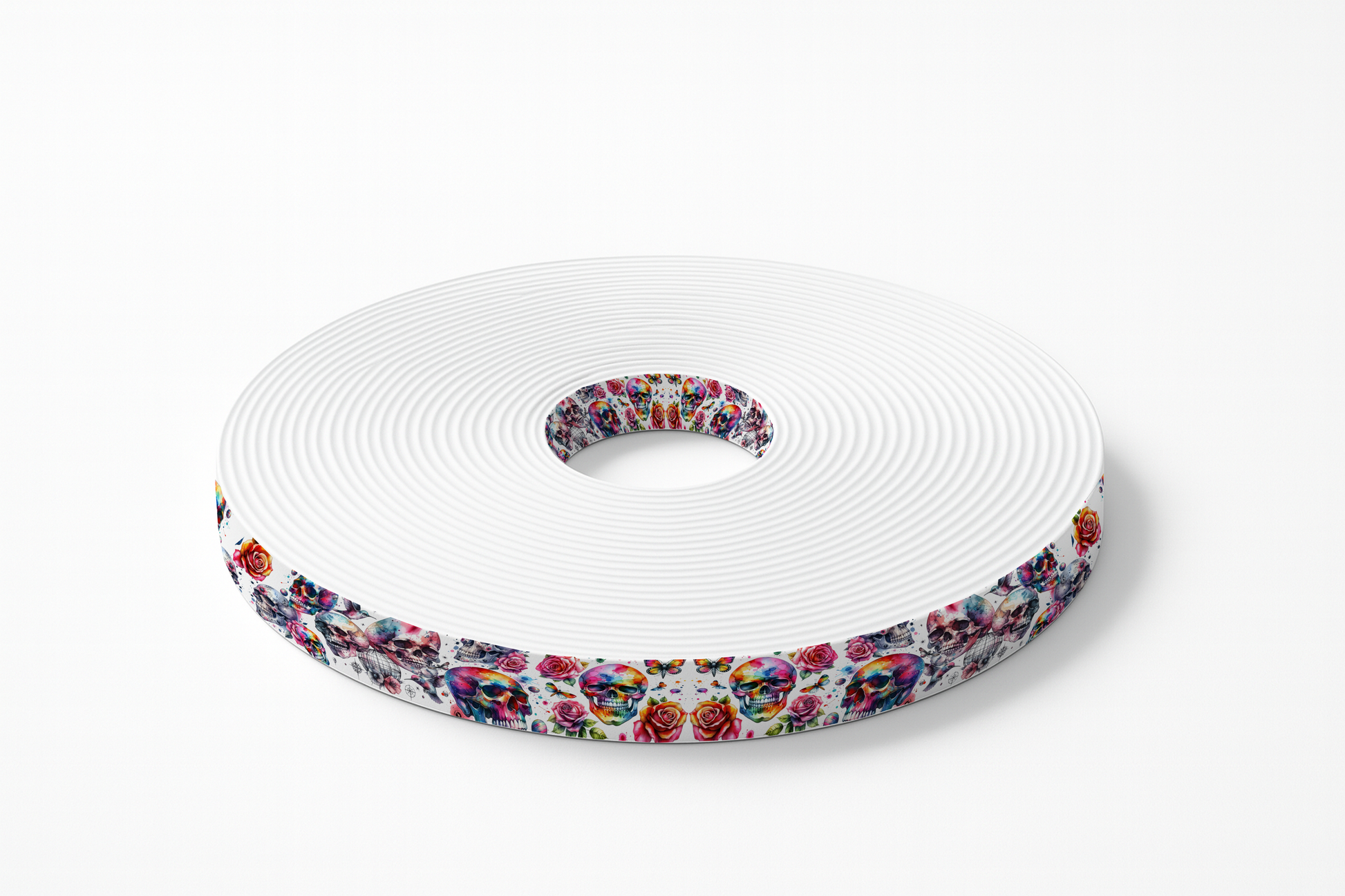 Ce BioThane imprimé met en scène une série de crânes stylisés aux couleurs vives et aux effets aquarelle, entourés de roses et d’éléments floraux sur fond blanc. L’esprit est à la fois gothique, rock et coloré, idéal pour une création qui ne passe pas inaperçue.