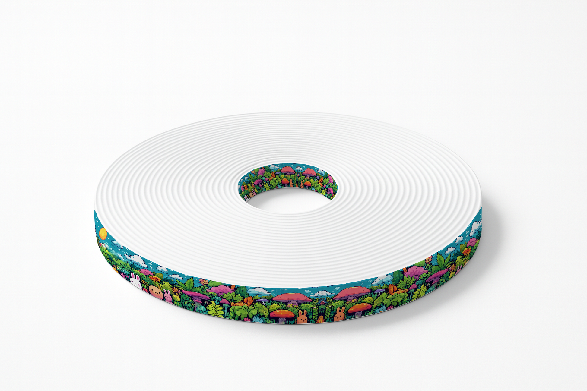 - 🌈 Motif : forêt colorée, champignons rouges, lapins, arc-en-ciel et ciel bleu