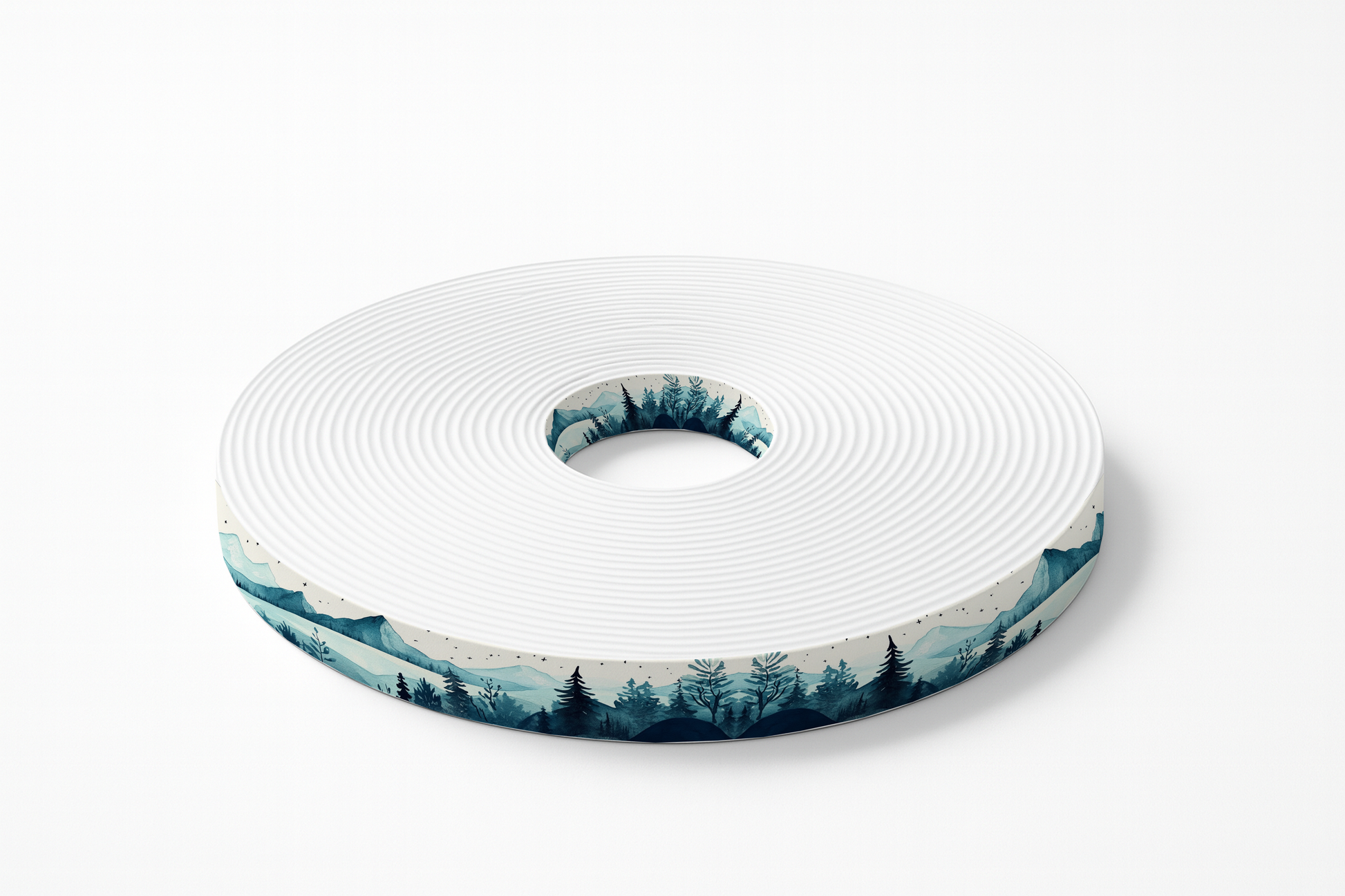 Ce motif délicat représente une chaîne de montagnes stylisées dans une sublime palette de bleus, illustrée à la manière d'une aquarelle sur fond clair. Des sapins et feuillages viennent agrémenter le paysage, évoquant les grandes étendues forestières et les paysages alpins baignés de calme.