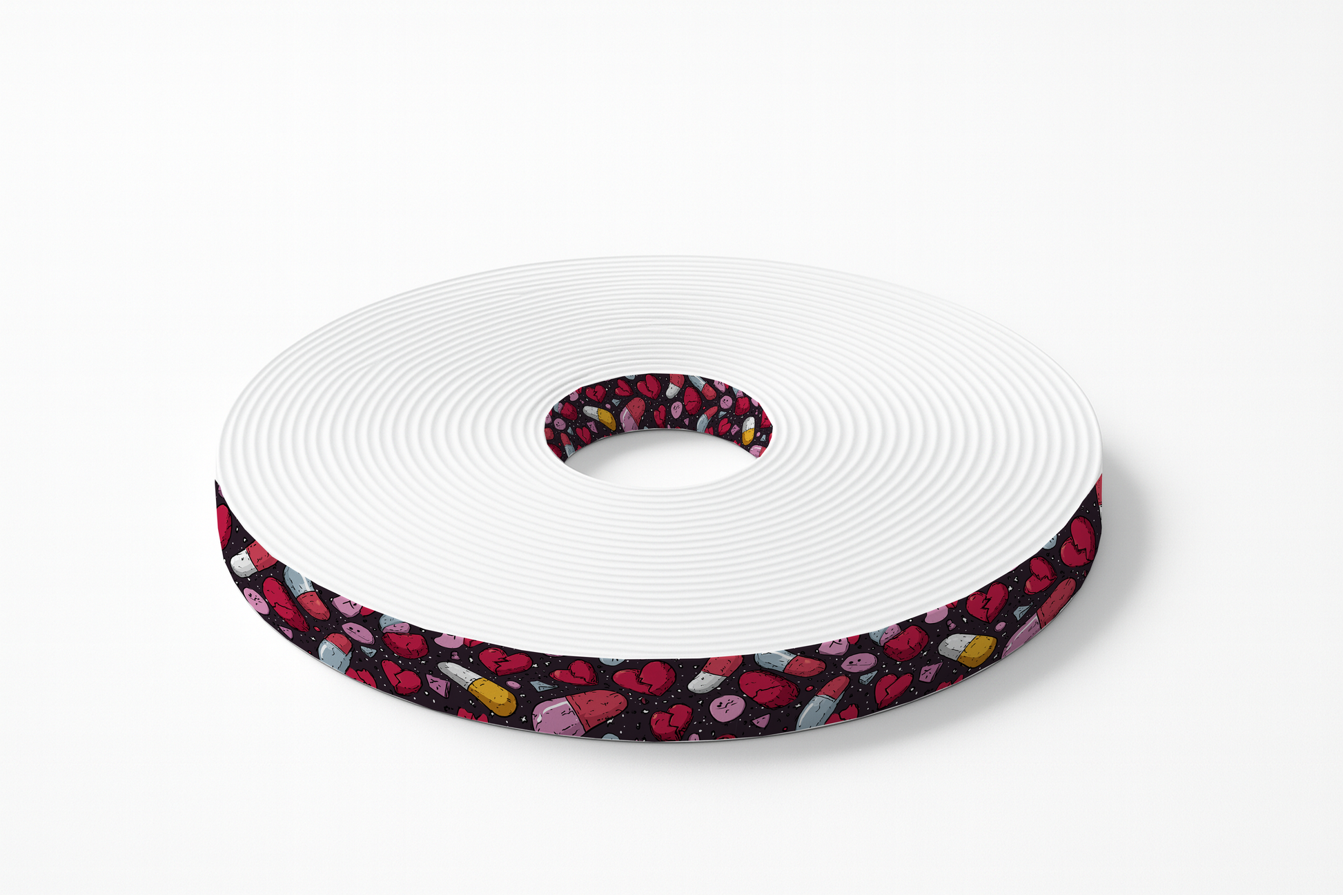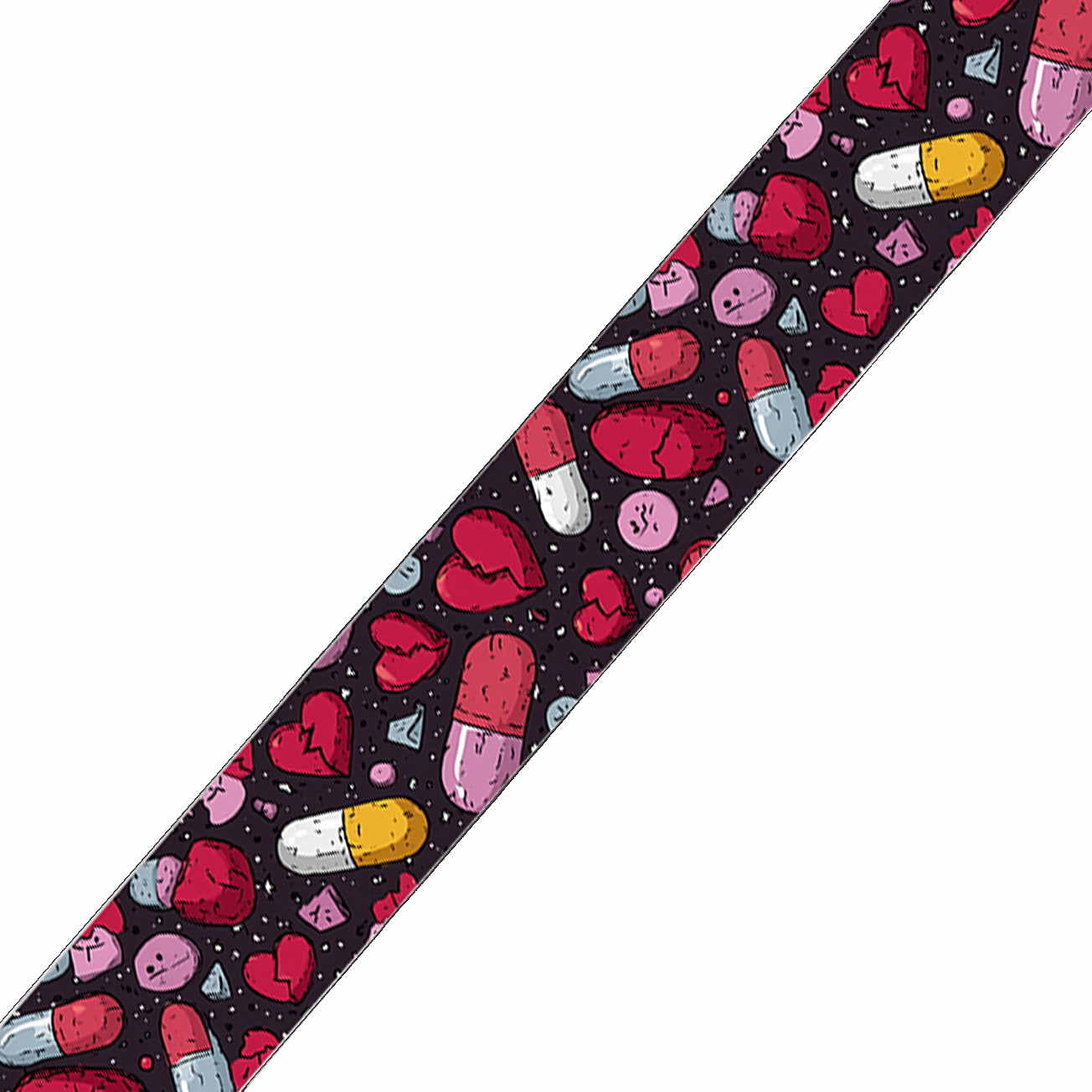Original et audacieux, ce BioThane imprimé mêle des cœurs rouges et roses, parfois brisés, à des gélules stylisées sur un fond sombre. Un motif à l’esthétique pop culture alternative, entre romantisme décalé et esprit rebelle.
