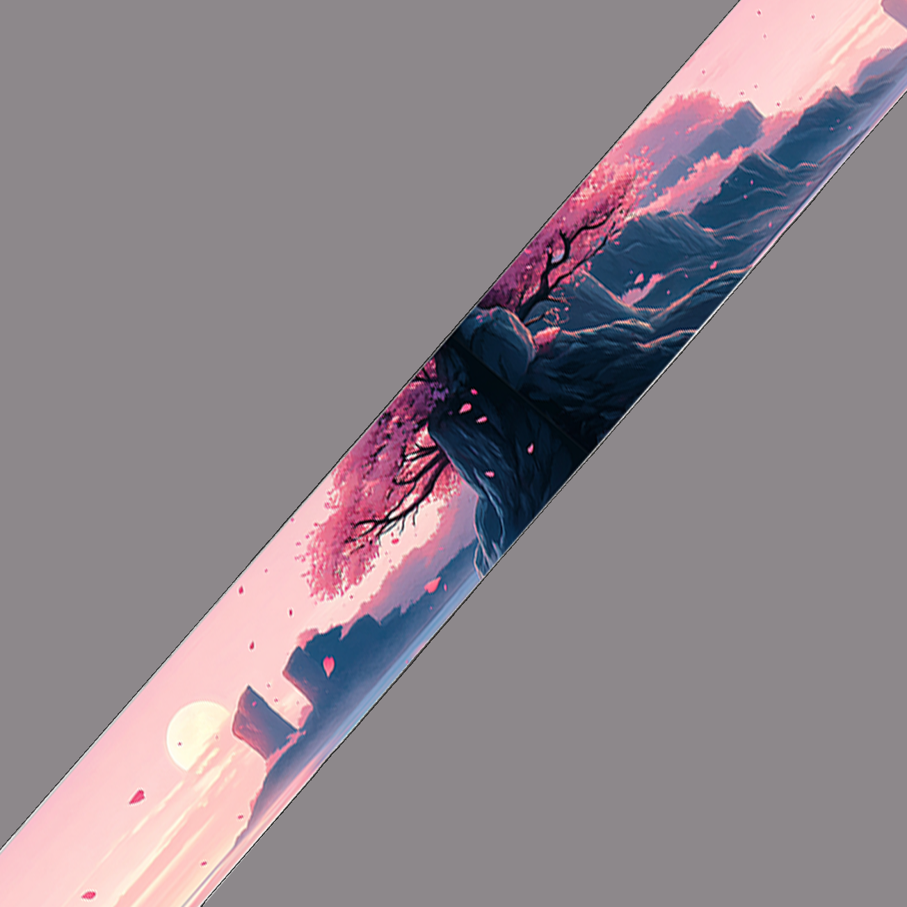 Ce motif délicat représente un arbre aux fleurs roses perché sur une falaise, face à un soleil couchant aux teintes poudrées. Les reliefs montagneux en arrière-plan, baignés de nuances bleu nuit et rose pastel, créent une atmosphère douce et contemplative.