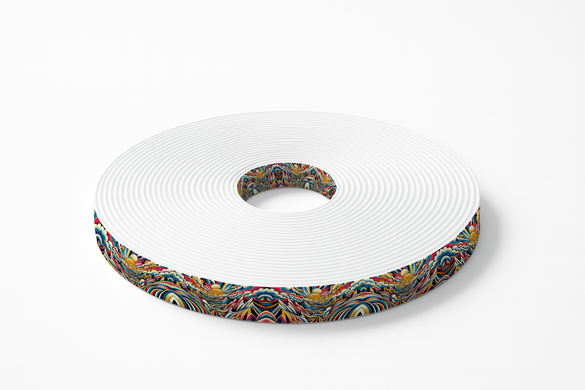 Plongez dans un univers haut en couleur avec ce motif "Tourbillon psychédélique rétro" imprimé sur BioThane®. Son design hypnotique mêle des vagues colorées, des nuages stylisés et des soleils rayonnants dans un style graphique intense et dynamique.