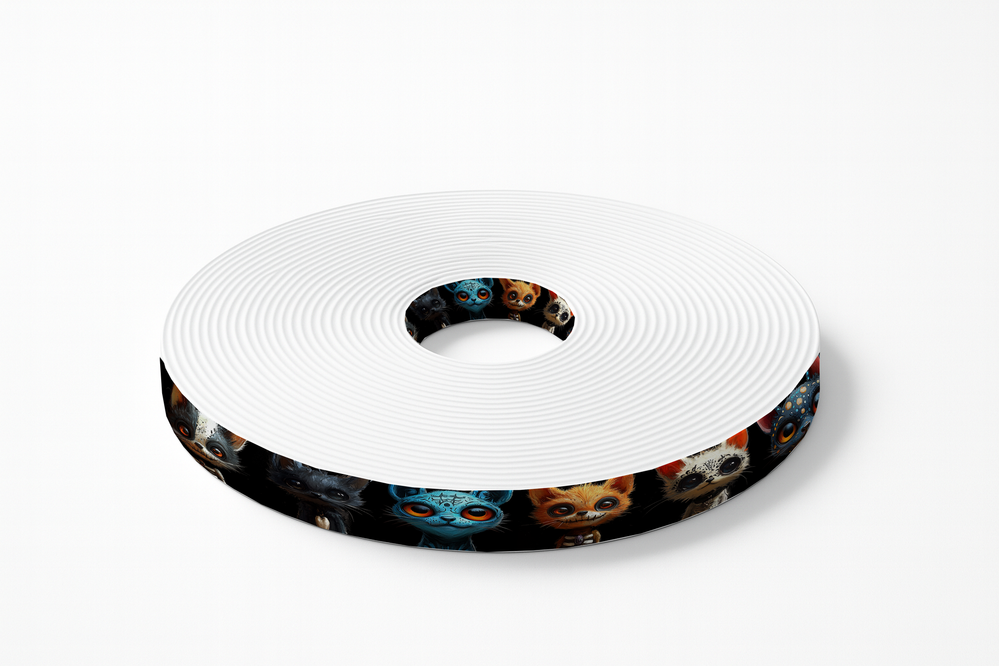 Découvrez ce motif original de BioThane imprimé mettant en scène des têtes de chats stylisées façon Dia de los Muertos, la célèbre fête mexicaine des morts. Chaque petit félin affiche une expression unique, des motifs colorés sur le visage et de grands yeux expressifs qui attirent le regard !