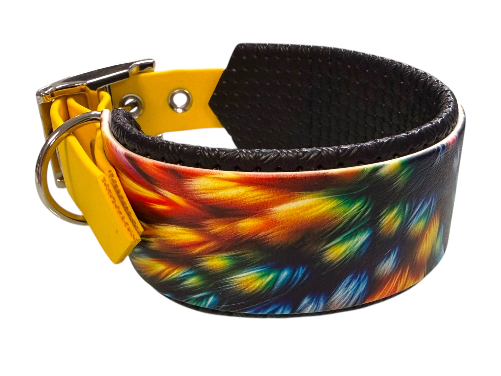 Un collier qui combine confort haut de gamme, résistance et éclat visuel 🌈🐕 Ce modèle se distingue par une partie centrale imprimée multicolore, associée à un doublage en mousse PVC pour un confort optimal au quotidien. Les extrémités jaune vif apportent une touche lumineuse et dynamique, parfaitement équilibrée par une bouclerie argent élégante et robuste.