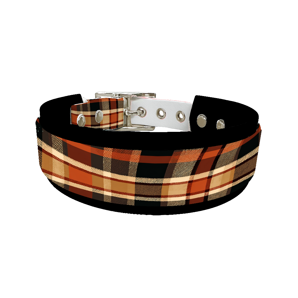 Un collier large, élégant et intemporel, inspiré des motifs tartan et des tissus écossais. Ce modèle associe une sur-bande imprimée de 25 mm (impression UV haute tenue) fixée sur une base large de 38 mm en BioThane®, pour un rendu à la fois chic, robuste et confortable.