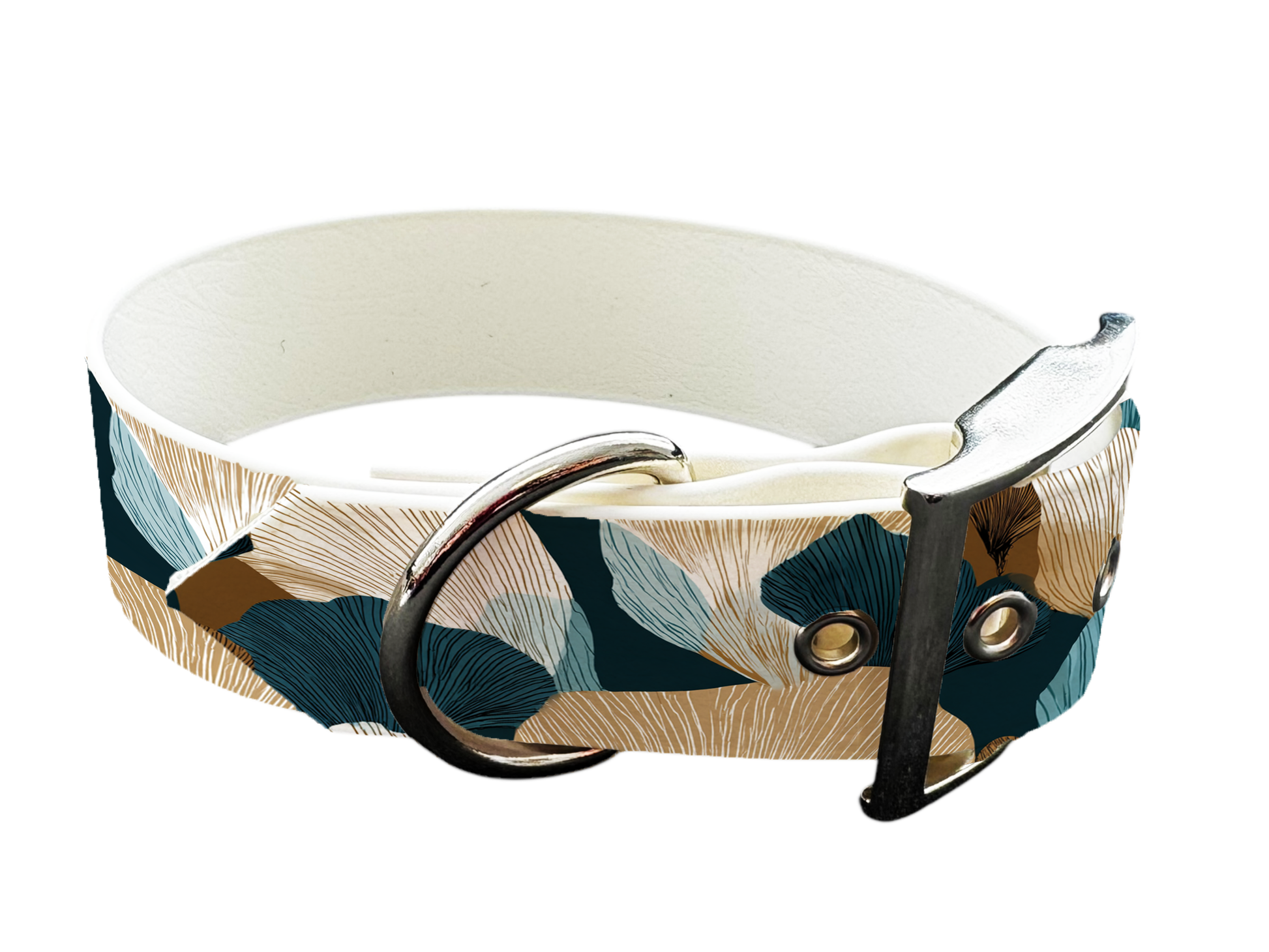 Comme une page d’herbier : pétales, feuillages et tiges stylisées s’invitent sur un collier 25 mm souple, imperméable et simple à vivre. Des couleurs nettes, prêtes à fleurir chaque sortie.