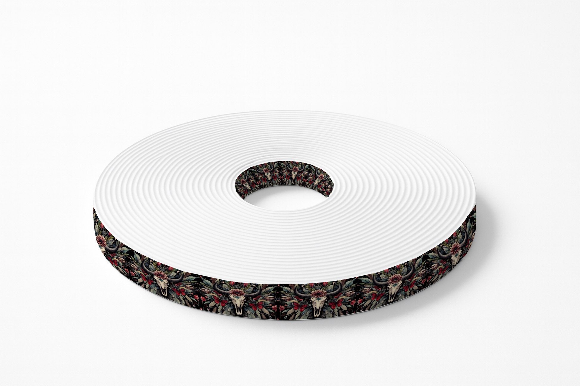 Ce motif mystérieux et élégant mêle le côté brut d’un crâne de taureau à la douceur des fleurs et des papillons rouges. Un design riche en détails sur fond noir, parfait pour un look à la fois bohème, spirituel et affirmé.