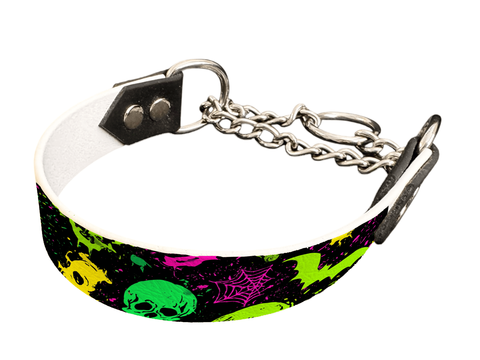 Faites entrer la magie d’Halloween dans les balades de votre compagnon ! Cette martingale 25 mm imprimée en UV haute qualité arbore des motifs terrifiants ou amusants : citrouilles souriantes, fantômes espiègles, chauves-souris ou encore manoirs hantés. Un collier unique qui allie style, confort et robustesse.