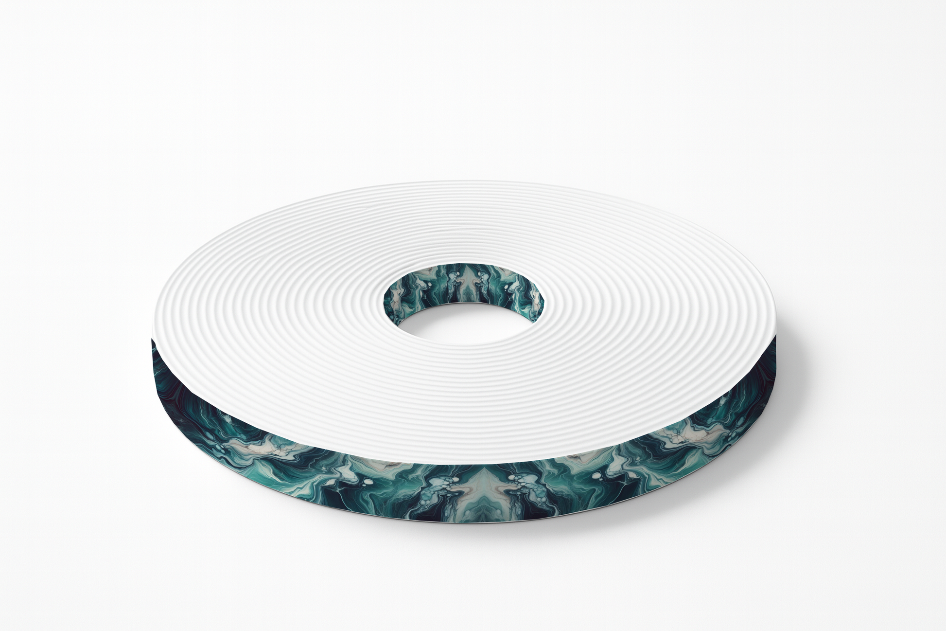 Offrez un style unique à vos créations avec cette sangle en BioThane® blanc imprimée à l'encre UV. Son motif marbré bleu glacier aux nuances profondes évoque les tourbillons d’une rivière gelée – à la fois intense et élégant.